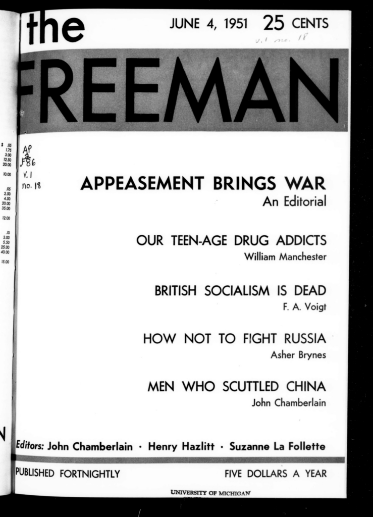 This issue of the Freeman explores different approaches to war in Korea, increasing drug use among young Americans, decreased favor for socialism in Britain, and more.