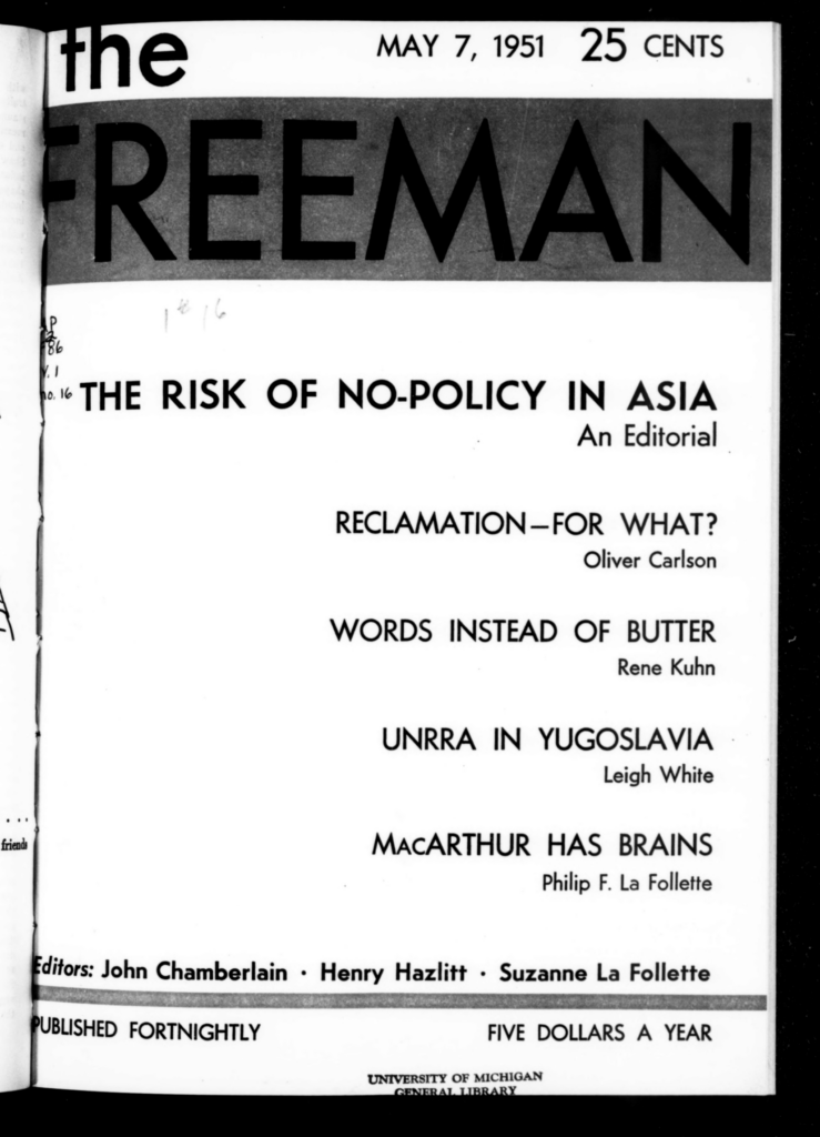 This issue of the Freeman explores American foreign policy, domestic farming policy, a critique of Justice Douglas’s Supreme Court rulings, and more.