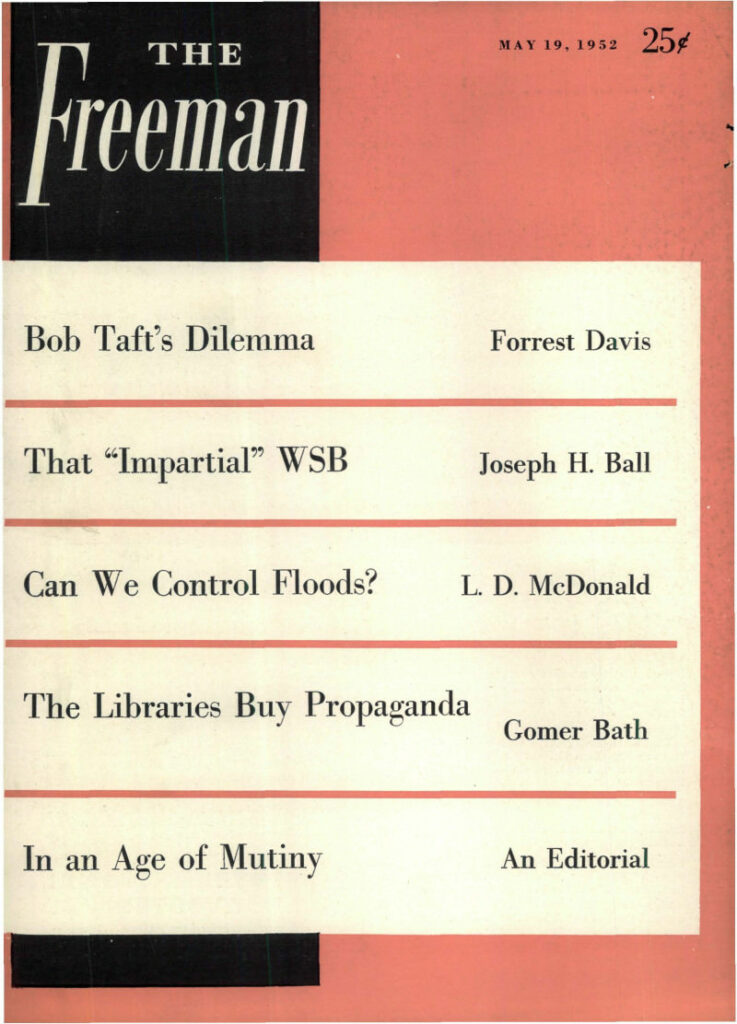 This issue of the Freeman explores Robert Taft’s foreign policy promises, the Wage Stabilization Board’s bias, libraries circulating propaganda, and more.