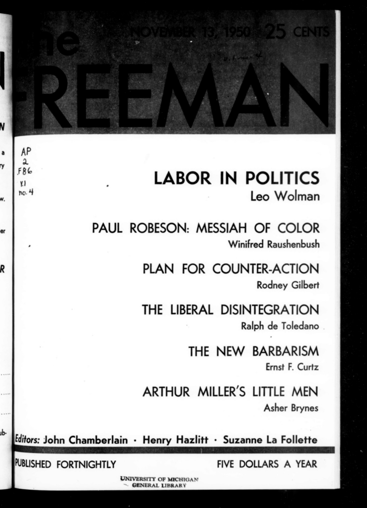 This issue of the Freeman explores American labor politics, Cold War politics, a profile of American musician, athlete, and communist activist Paul Robeson, and more.