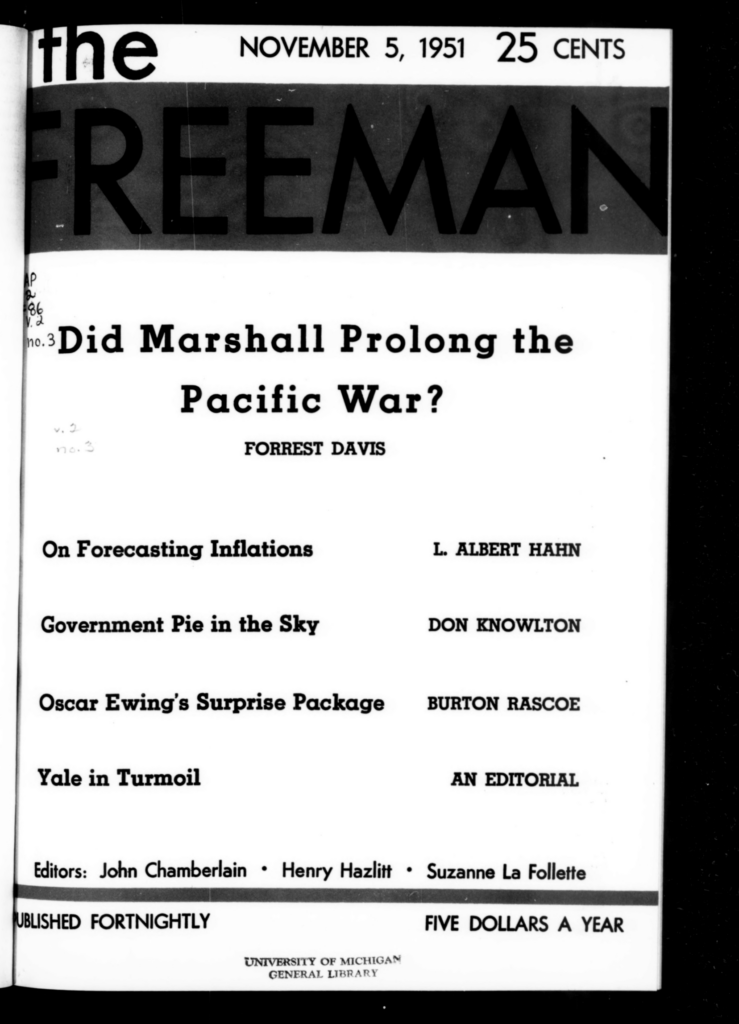 This issue of the Freeman explores General Marshall prolonging war in the pacific, inflation forecasting, international labor law, and more.