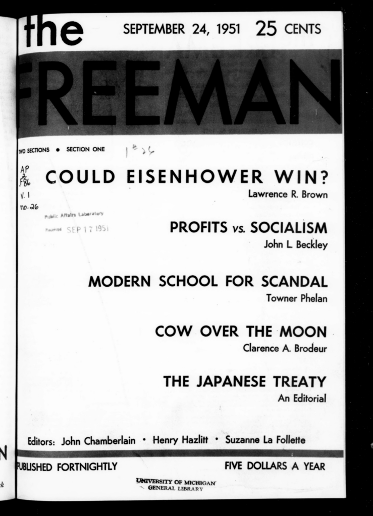 This issue of the Freeman explores a peace treaty with Japan, Eisenhower’s attempt to win the presidency, profits vs. socialism, and more.